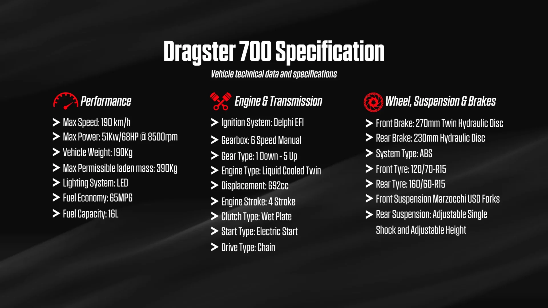 El motor y las prestaciones son idénticos en todos los modelos Dragster 700.